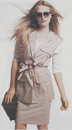 Уверенная. Что нужно охотницам за приключениями? Просторный жилет, снабженный вместительными карманами с завязывающимся поясом, а также облегающая юбка с высокой талией.