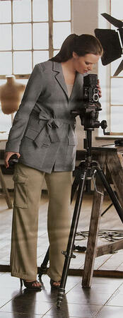 В фокусе. Элегантный, как у блейзера, крой и при этом очень комфортный материал- двухсторонний трикотаж. Вместе с завязывающимся на бант мягким поясом он придает нашему жакету непринужденный вид. А брюки могут похвастаться вместительным карманом и кулисками на штанинах.