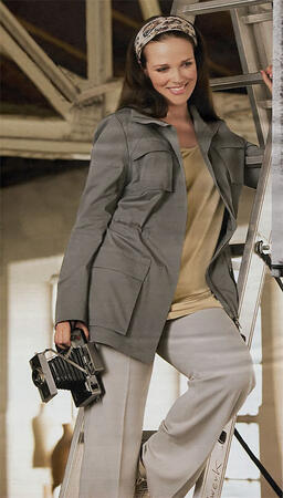 Улыбочку! Поводом для хорошего настроения может стать куртка с накладными карманами и кулиской на талии. Под ней- шелковый пуловер с рукавами реглан. Прямые брюки собраны сзади на резинку.