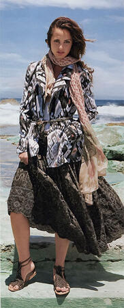 Прибой. Слегка приталенный двубортный блейзер с этническим рисунком- то, что надо для дальних странствий. Он застегивается на потайные кнопки и снабжен удобными накладными карманами.