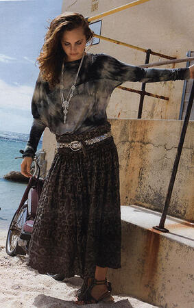 Баланс. Трикотажный пуловер с цельнокроеными рукавами "летучая мышь" пригодится в любой поездке. Один из вариантов комбинирования - с расклешенной юбкой, которая, как и пуловер, имеет широкую кокетку, но только с драпировкой.