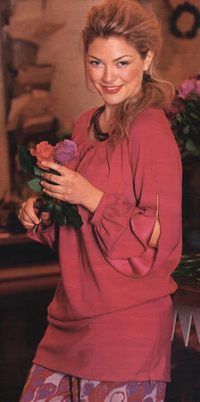 Майская роза. Эта модель с круглым вырезом и пышными рукавами реглан на небольших манжетах своим покроем напоминает крестьянскую блузу. Присборенная на бедрах, она образует небрежный напуск, скрывающий все недостатки фигуры.