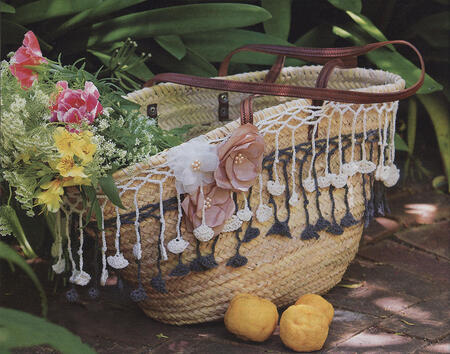 У прекрасной садовницы обязательно должна быть корзинка или такая плетеная сумка, украшенная цветами и вязаной бахромой.