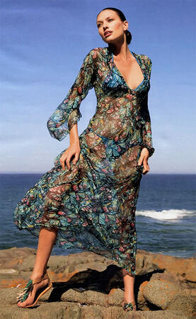 Легкое дуновение. Глядя на воздушный шифон с такой эффектной набивкой, можно представить, что вас окружила стая прелестных бабочек… В платье с фигурными рукавами реглан и глубоким вырезом горловины, надетом поверх бикини, вы будете очень соблазнительны.