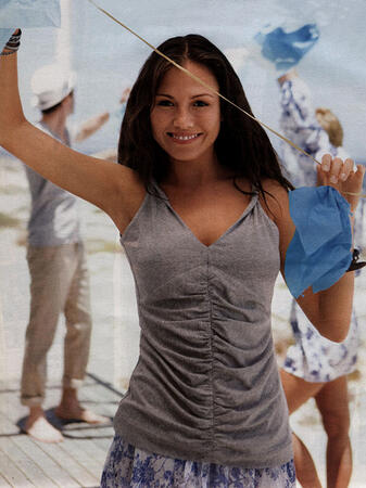 Поднять паруса! Трикотажный топ на тонких перекручивающихся бретелях, присборенный вдоль переднего среднего шва, выглядит весьма привлекательно и хорошо сочетается с широкой юбкой из набивного батиста.