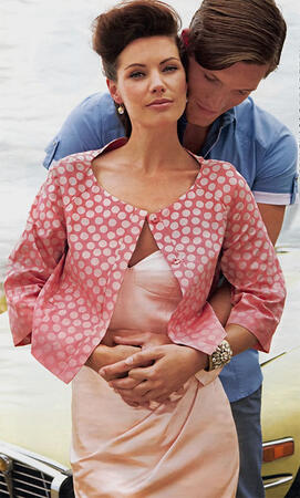 Розовая мечта. Подчеркивающее фигуру платье с открытыми плечами, асимметричной драпировкой и "бантом" на талии, а сверху короткий жакет без воротника с рукавами реглан из ностальгической ткани в горошек - в этом ансамбле вы будете похожи на саму Одри Хепберн!