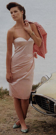 Розовая мечта. Подчеркивающее фигуру платье с открытыми плечами, асимметричной драпировкой и "бантом" на талии, а сверху короткий жакет без воротника с рукавами реглан из ностальгической ткани в горошек - в этом ансамбле вы будете похожи на саму Одри Хепберн!