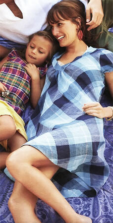 Лидирует клетка. Женское платье А-силуэта со складками у горловины выкроено по косой. Детская туника имеет широкие, перекрещивающиеся сзади бретели с игривыми оборками, а шорты снабжены карманами и отворотами на патах.