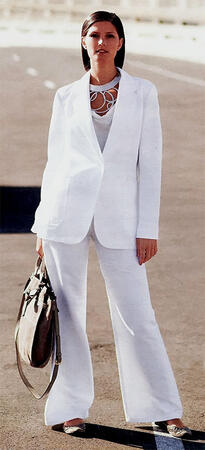 Взгляд в будущее. Можете быть абсолютно уверены: элегантный брючный костюм из белого габардина принесет вам удачу! Приталенный блейзер с длинными лацканами и скругленными бортами скрывает все недостатки фигуры, а расклешенные с пятью карманами не сковывают движений.