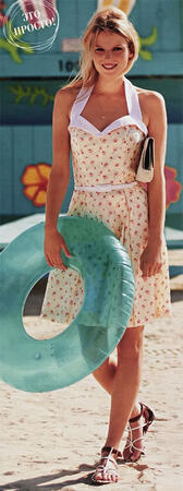 Пляжная романтика. Верхняя часть корсажа с отделочными планками из пике и завязывающиеся вокруг шеи бретели образуют вырез, напоминающий по форме сердечко. Добавьте к этому расклешенную юбку со встречными складками, подчеркните талию тонким ремешком- и симпатичный летний сарафан готов!