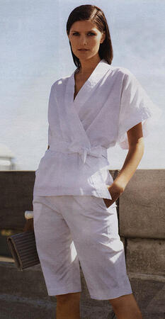 В духе самураев. Дальневосточный минимализм перекликается с европейской элегантностью. Планки бортов и пройм с декоративными строчками и такой же завязывающийся пояс делают эту блузку с запахом похожей на костюм для боевых искусств.