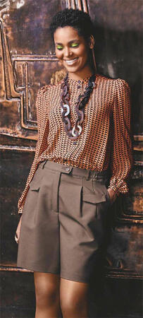 Вам кажется, что блузки слегка устарели? Предлагаем модель сдержанного кроя с маленьким воротником-стойкой и слегка присборенными по окату рукавами. Ее оживляют ритмичный рисунок и милые деревянные пуговички. С бермудами - то что надо!