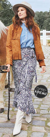 Юбка с запахом и развевающимся воланом выглядит потрясающе, но при этом быстро и легко шьется. Помимо завязок предусмотрена незаметная пуговица на поясе.
