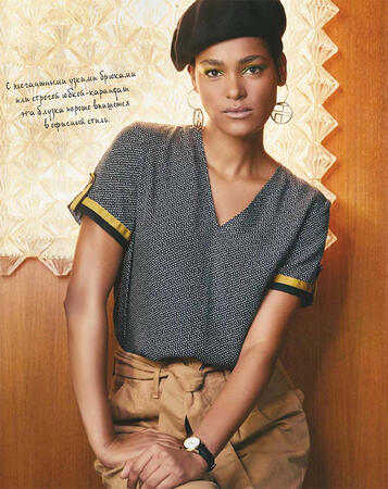 Практичные детали тоже могут быть очаровательными. Туника с глубоким V-образным вырезом это подтверждает: репсовые ленты по краю рукавов имитируют стильные отвороты с патами.