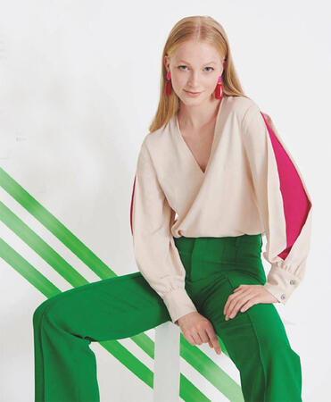 Секретное оружие этой блузки в большой встречной складке вдоль рукава, которая излучает ярко-розовое сияние изнутри. V-образный вырез и манжеты, наоборот, нарочито сдержанны.