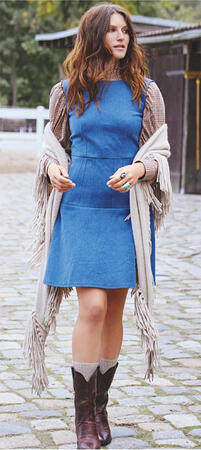 Мы привыкли к джинсовым платьям рубашечного кроя или сарафанам с нагрудником. Наша женственная модель меняет стереотипы и чудесным образом преображает фигуру за счет вертикальных вытачек на лифе и кокеток у расклешенной юбки.