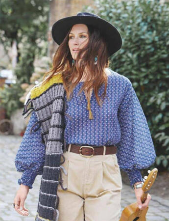 Модель из легкой жатой ткани с пышными рукавами, собранными на резиновые жилки, напоминает крестьянскую рубашку. Разрез у горловины можно оставить открытым или завязать кожаными ленточками с кисточками.