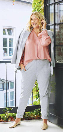 День пролетит незаметно! Спортивно-элегантные брюки с узкими отворотами, карманами в боковых швах и эластичным поясом гарантируют максимальный комфорт.