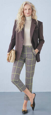 Офисные брюки еще не были настолько модными: клапаны на карманах с отрезными бочками отделаны атласным кантом, неоновые полоски образуют крупную клетку на более мелком узоре.