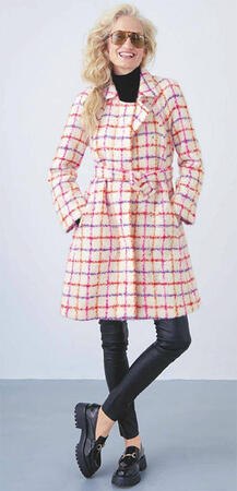 Забавная клетка превращает пальто А-силуэта со встречной складкой на спине, отложным воротником и завязывающимся поясом в настоящий модный вызов.