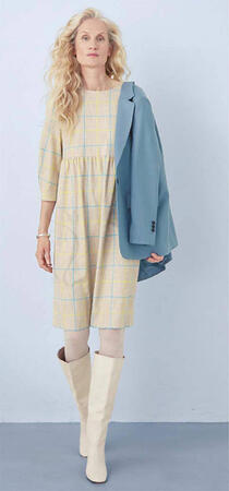 Свободное платье с объемными рукавами, присборенной юбкой и застежкой на пуговицу выглядит одинаково эффектно как соло, так и в комбинации с укороченным жакетом из той же ткани.