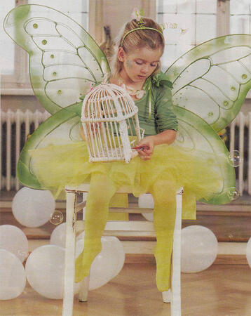 Крылышки: стальная проволока 6 м*4 мм, бокорезы, 2 пары белых тонких колготок (мин. размер 40-42), изолента, спрей для текстиля зеленый, клеевая краска блестящая зеленая, атласные ленты и тесьмы желтые, стразы зеленые: Д 2 см 20 шт, Д 1,2 см 12 шт, Д 5 мм 120 шт; клей для стразов; искусственные цветы, пистолет для горячего склеивания. Обруч и колье: тонкий обруч для головы, зеленые атласная лента и проволока в бумажной оплетке; искусственные цветы, пистолет для горячего склеивания.