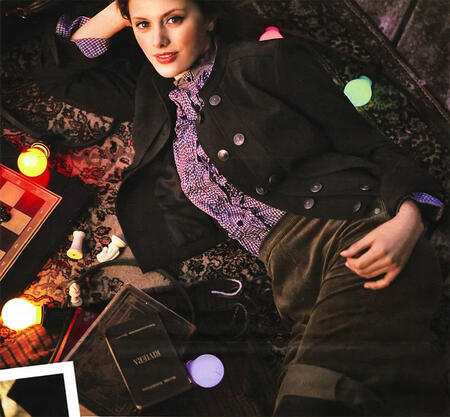 У короткого приталенного жакета, напоминающего военную униформу, довольно сложный крой: благодаря ему кажется, что сверху надет жилет. На вельветовых бермудах сбоку имеется застежка на пробивающиеся кнопки.