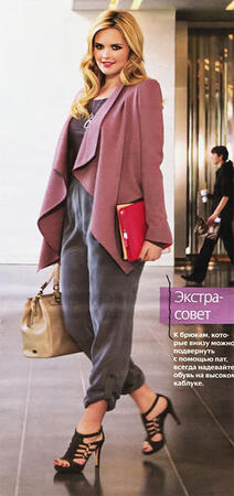 Приталенный жакет с драпирующимися полочками и присборенными по окату рукавами плюс брюки,