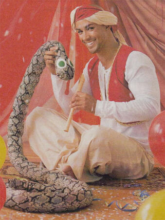 В шальварах , тюрбане и коротком жилете , отделанном по краю тесьмой , он может смело заглянуть змее в глаза... тем более, что она самодельная!