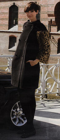 Двубортное пальто в стиле 60-х с воротником-стойкой, меховыми рукавами