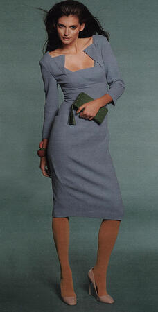 В этом платье -футляре с завышенной линией талии в первую очередь обращает на себя внимание необычная форма выреза горловины,