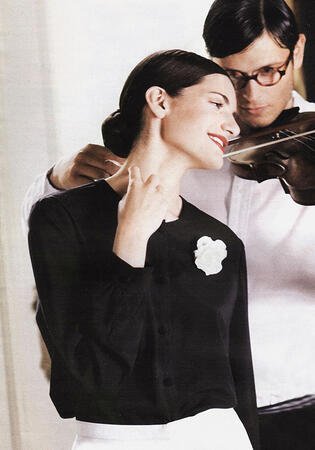 Созвучна музыке. Все как по нотам: Отсутствие воротника подчеркивает линию шеи, маленькие пуговки на планке и контрастная брошь придают этой модели изысканность.