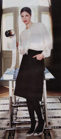 Черно-белое фото. Легкая блузка без воротника и с потайной застежкой привлекает внимание романтичным жабо, пришитым к срезу горловины лишь одной полочки. Прямая противоположность - юбка длиной до середины колена, слегка расклешенная книзу, с накладными карманами и декоративными строчками.