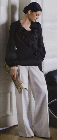 На грани искусства. У этой эффектной блузки с запахом матовая сторона креп-сатина является лицевой, и лишь воланы вдоль выреза горловины демонстрируют его блестящую сторону. Длинные завязки фиксируют блузку на талии. Широкие брюки с заутюженными стрелками а-ля Марлен Дитрих полностью скрывают обувь. В боковых швах предусмотрены карманы.