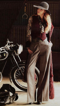 Вне времени. Новый вариант классической тройки: блузка с воротником-бантом, короткий жилет с прорезными карманами в рамку и брюки клеш с заутюженными стрелками.