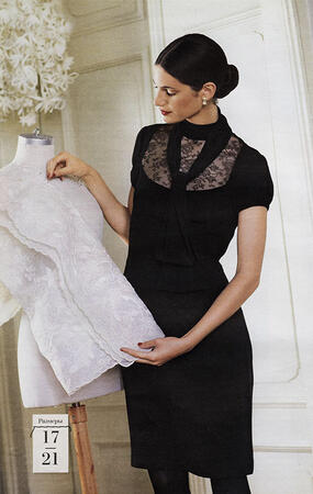 Чудесные вариации. Маленький шедевр от Коко - черное платье предстает в новом свете: с воротником-стойкой, шарфом и соблазнительной кружевной вставкой на груди. Отрезное по талии и зауженное книзу, оно как нельзя лучше подходит невысоким женщинам. Короткие рукава собраны на тонкие манжеты.