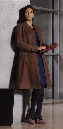 Нуга, Синий, Баклажан. Что прежде всего привлекает внимание в шерстяном пальто А-силуэта с воротником-шалькой и потайной застежкой? Длинные косые складки на полочках, доходящие до уровня прорезных карманов. Рукава кимоно внизу собраны на паты.