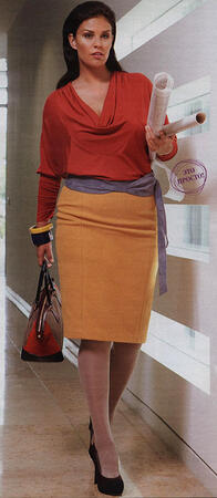 Коралл, сирень, шафран. Свободный пуловер с мягкими драпировками и рукавами кимоно контрастирует с узкой юбкой и замшевым поясом в японском стиле.