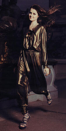 Чистое золото. Трикотажный комбинезон с драгоценным отливом просто ослепляет! Брюки очень длинные, поэтому зауженная нижняя часть у штанин естественным образом собирается в складки.