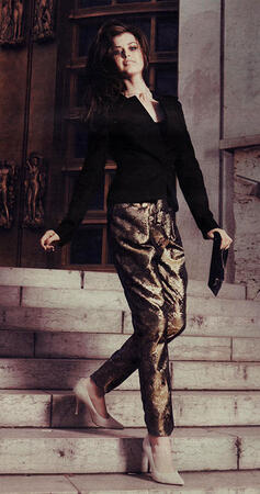 Смотрите, это я! Короткий приталенный жакет с погонами и вертикальными планками у горловины отлично комбинируется с брюками в "китайском" стиле из блестящей парчи. Вверху они сидят свободно за счет глубокой складки у пояса, а книзу сужаются.