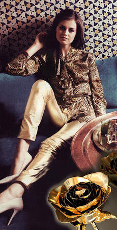 Царевна Будур. Длинную шелковую блузку с расцветкой под леопарда украшает асимметричный волан от горловины до талии. Зауженные книзу брюки с карманами в боковых швах выполнены из натуральной кожи золотистого цвета.
