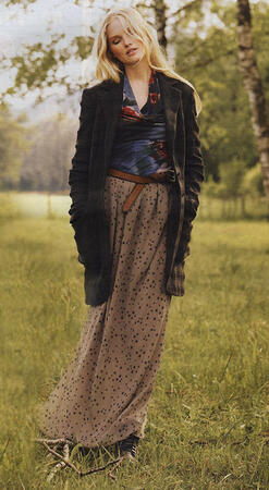 Полная гармония. Для неспешных прогулок на природе пригодится романтичная юбка со звездным узором, боковыми разрезами и складками вдоль талии, а также длинный жакет из шерстяной ткани в крупную клетку со скругленными внизу полочками и большими накладными карманами.