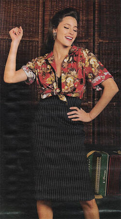 Вечный праздник. Изюминкой этой юбки - клин годэ и косые вытачки на заднем полотнище, подчеркивающие округлые ягодицы. У блузки нет застежки, она просто завязывается на талии узлом.