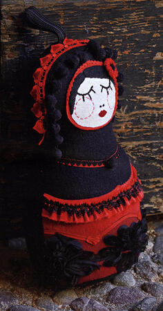 Ее наряд выполнен из фетра, декорирован кружевом, лентами и тесьмой.
