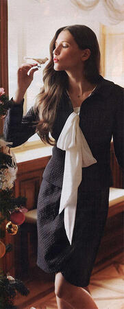 Очень мило. Благодаря поперечным и продольным рельефным швам короткий жакет из пике сидит точно по фигуре. Юбка с запахом привлекает внимание изысканными складками у пояса и скругленными передними полотнищами.