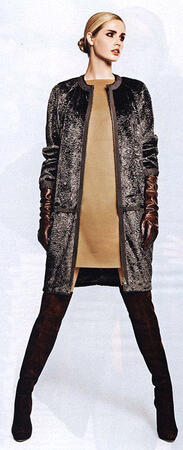 Нежный каракуль. Современные искусственные меха прекрасны сами по себе и греют не хуже натуральных. Пальто без воротника, с рукавами реглан слегка заужено книзу. Репсовые ленты в тон меха акцентируют внимание на горловине, застежке-молнии и заниженной линии талии. Высокие сапоги и длинные перчатки отлично дополняют эту модель.