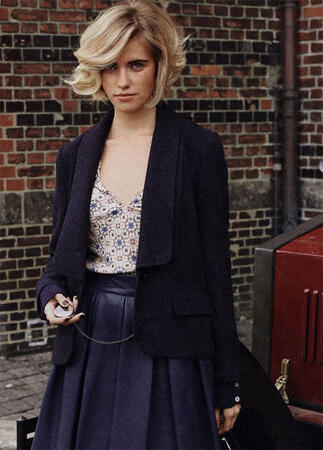 Тайная миссия. Хотите идти в ногу со временем? Тогда вам совершенно необходим приталенный шерстяной жакет с удлиненным шалевым воротником. К нему в тон кожаная юбка длиной выше колен с круговыми складками и пестрый топ с V-образным вырезом горловины. Винтажные часы на цепочке не отменяют наличие мобильного телефона или iPhone в кожаном чехле, который тоже можно сшить самим.