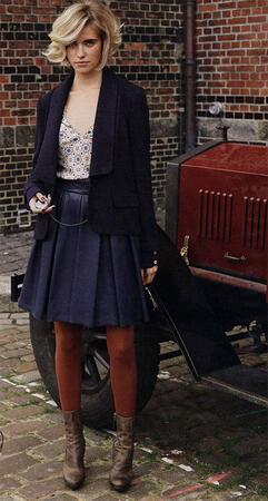 Тайная миссия. Хотите идти в ногу со временем? Тогда вам совершенно необходим приталенный шерстяной жакет с удлиненным шалевым воротником. К нему в тон кожаная юбка длиной выше колен с круговыми складками и пестрый топ с V-образным вырезом горловины. Винтажные часы на цепочке не отменяют наличие мобильного телефона или iPhone в кожаном чехле, который тоже можно сшить самим.