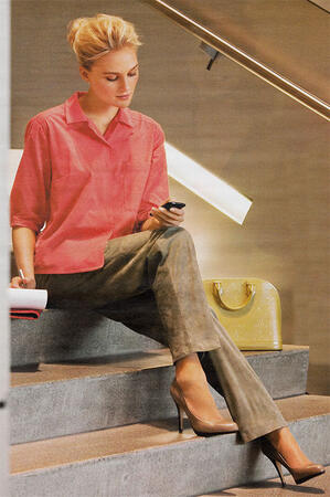 Деловой разговор. Наша блузка заслуживает внимания не только из-за красивого кораллового оттенка. Она застегивается на маленькие кнопки и имеет рукава 3/4 с завязками по краям. К ней как нельзя лучше подходят прямые брюки из мягкой замши- предмет мечтаний многих модниц.